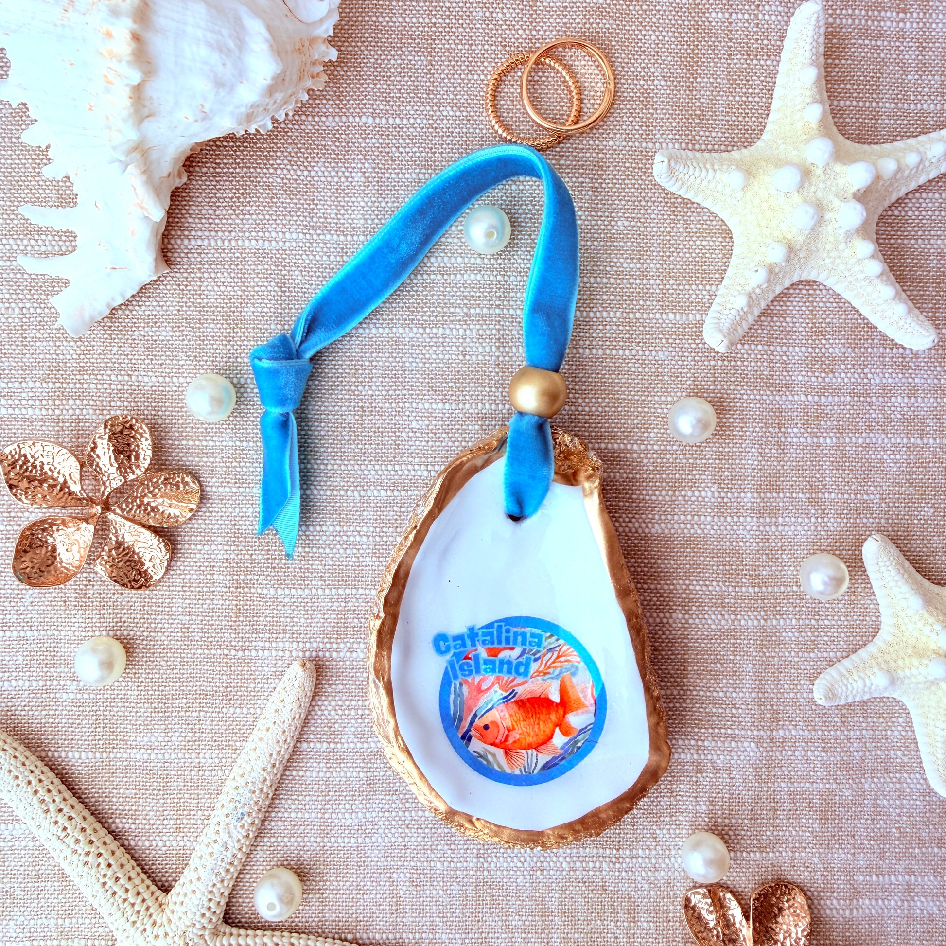 A lovely keepsake Easter ornament with a blue and orange Catalina Island Garibaldi fish design. Hand decorated using a natural oyster from the shores of the USA.