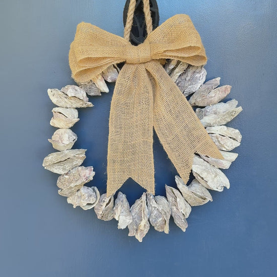 A fabulous find for your coastal inspired home decor. This handcrafted oyster wreath using premium 3-4" cupped oysters, this striking 14" wreath brings coastal charm to any space. Each piece is thoughtfully assembled and adorned with a warm rustic burlap bow, complete with a sturdy 7mm jute rope hanger for easy display.