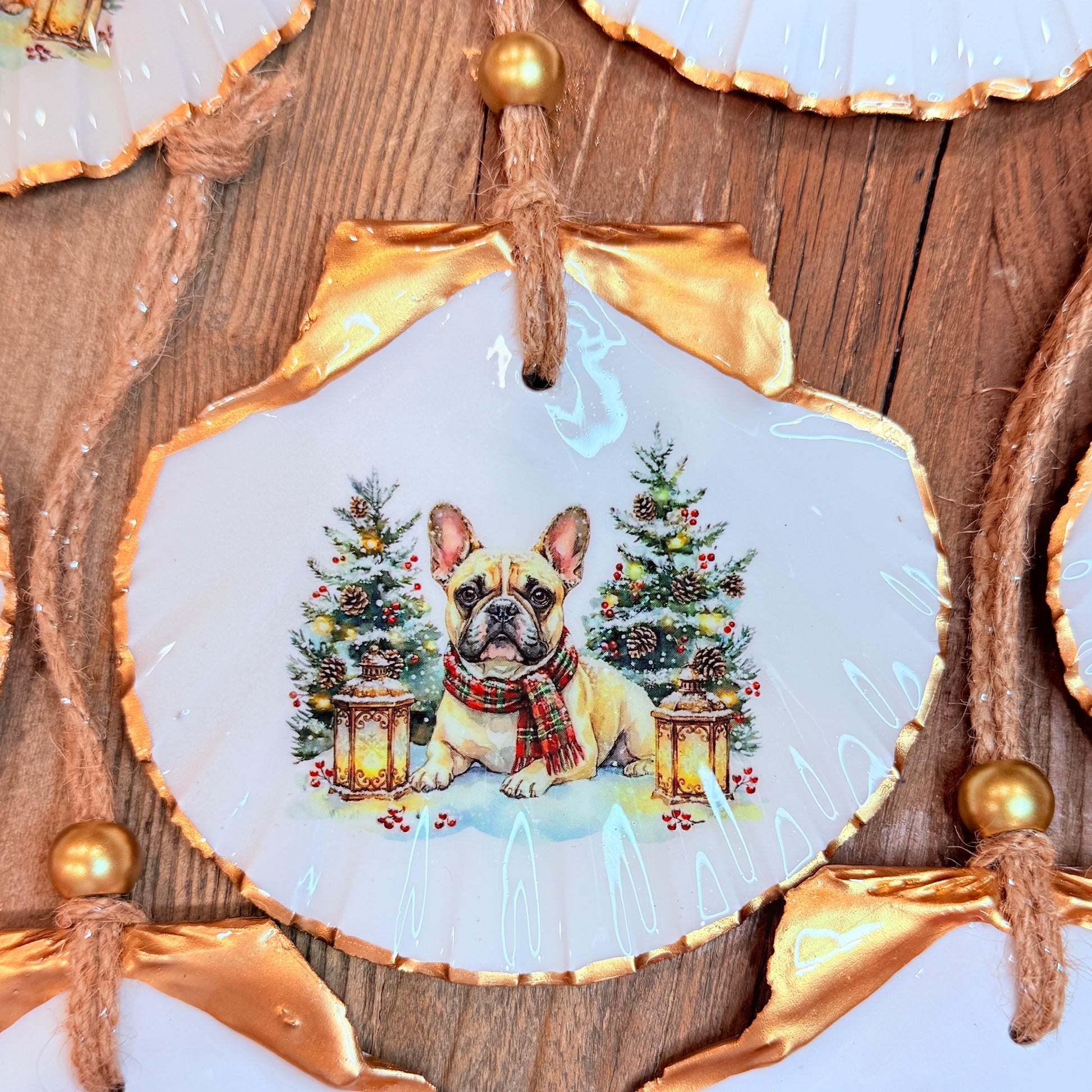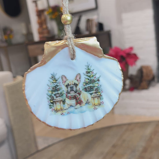 A lovely keepsake ornament with a Christmas French Bulldog design. Hand decorated using a natural Irish Flat Scallop shell from the shores of the USA.