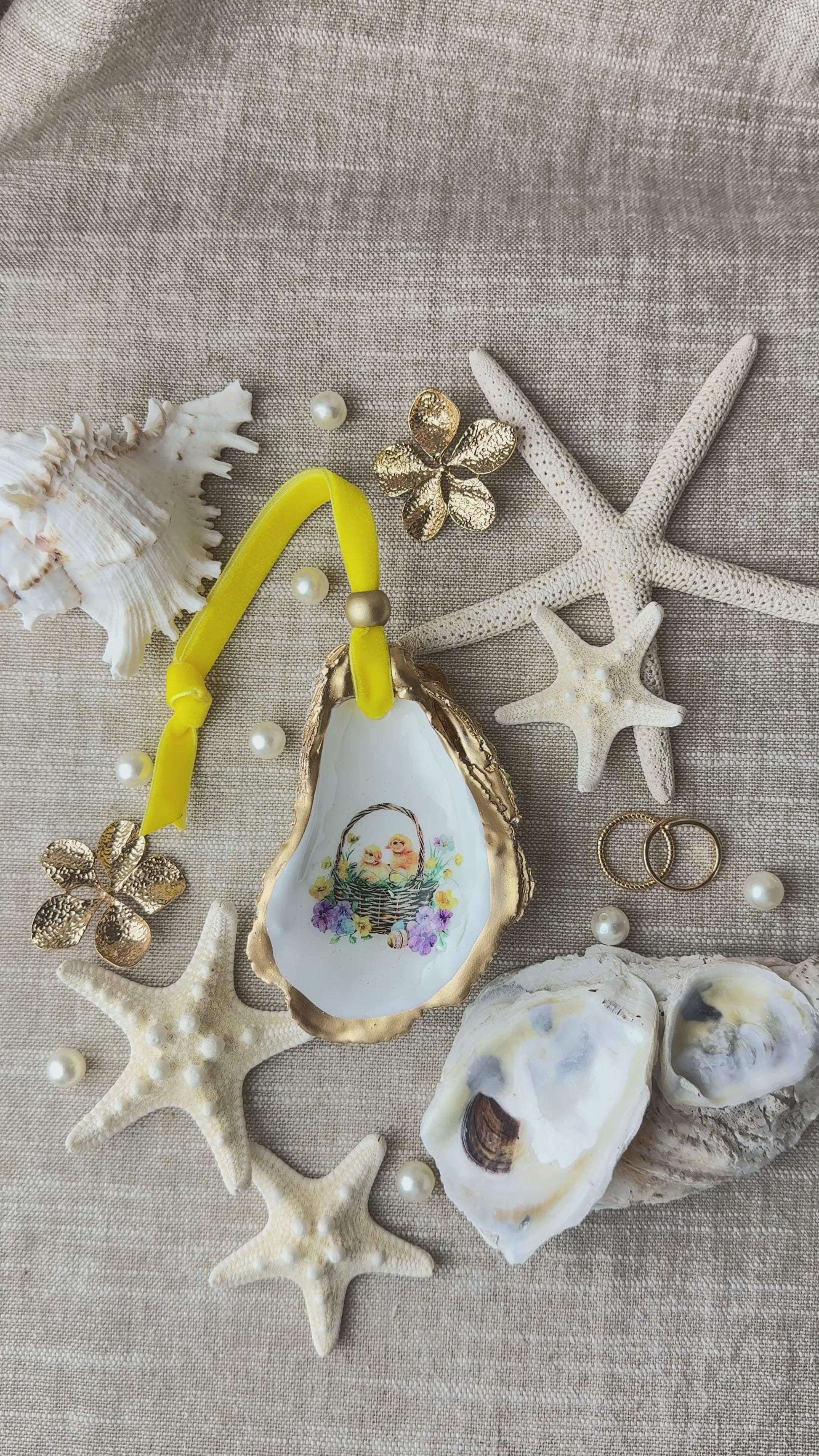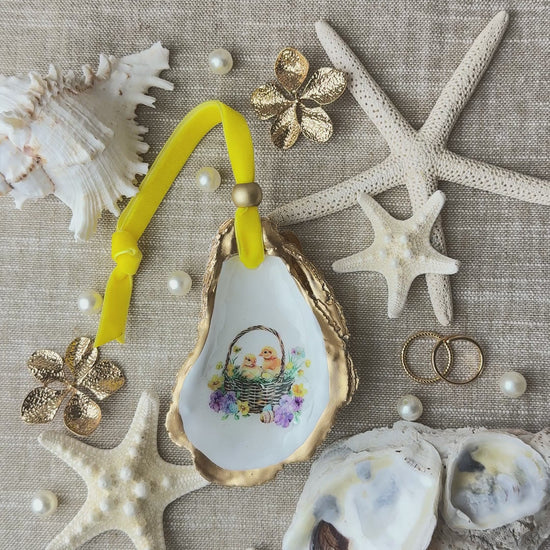 A lovely keepsake Easter ornament with an Easter basket with yellow chicks and floral design. Hand decorated using a natural oyster from the shores of the USA.