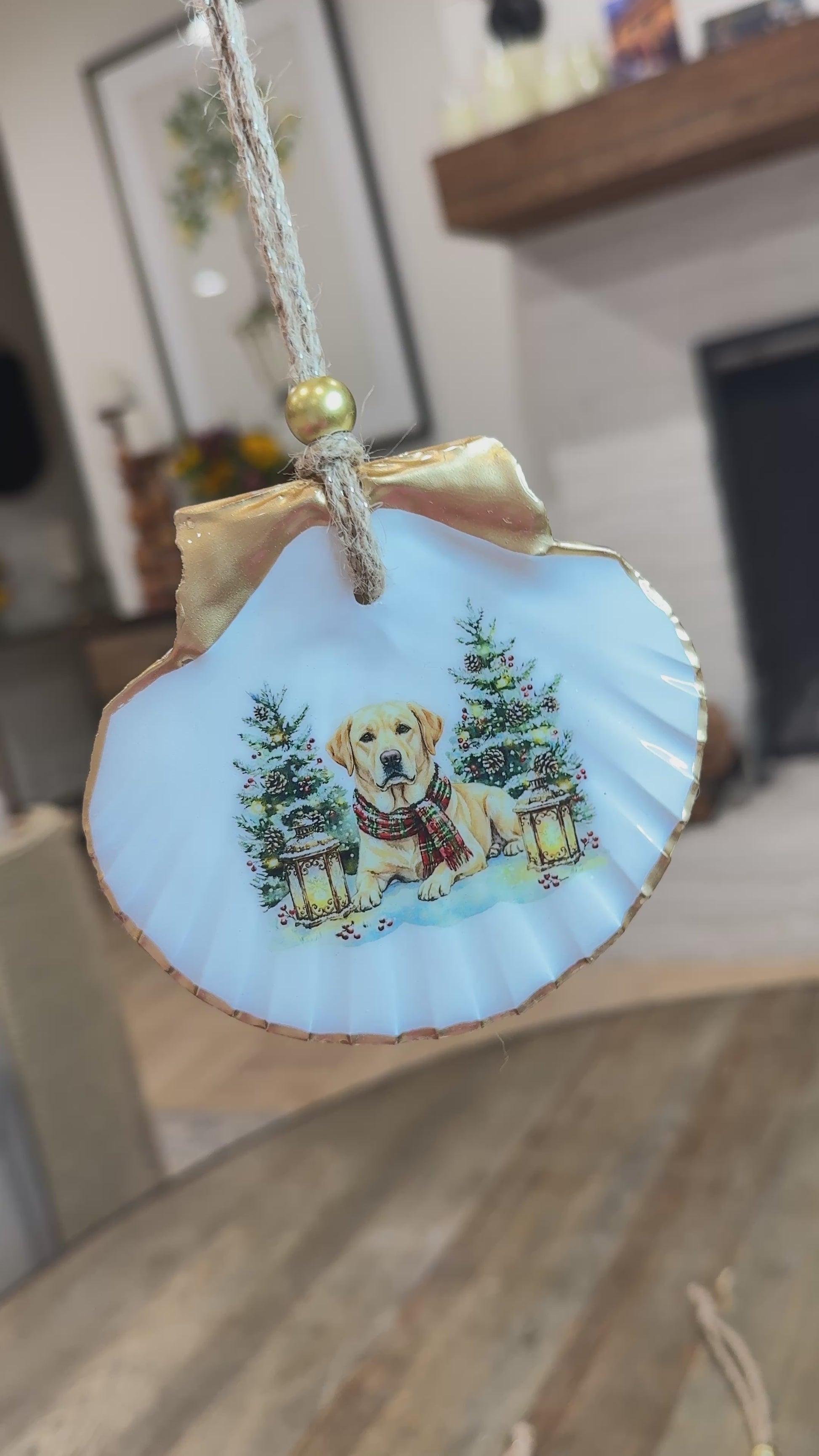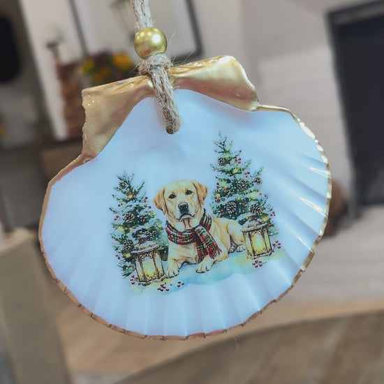 A lovely keepsake ornament with a Christmas Golden Labrador design. Hand decorated using a natural Irish Flat Scallop shel from the shores of the USA.