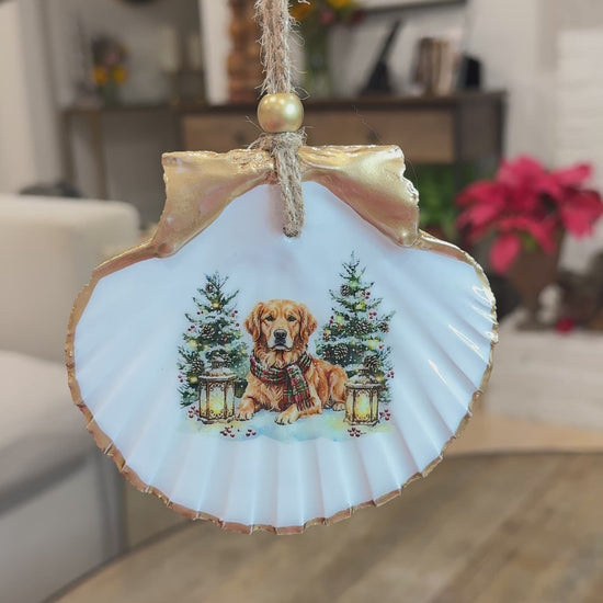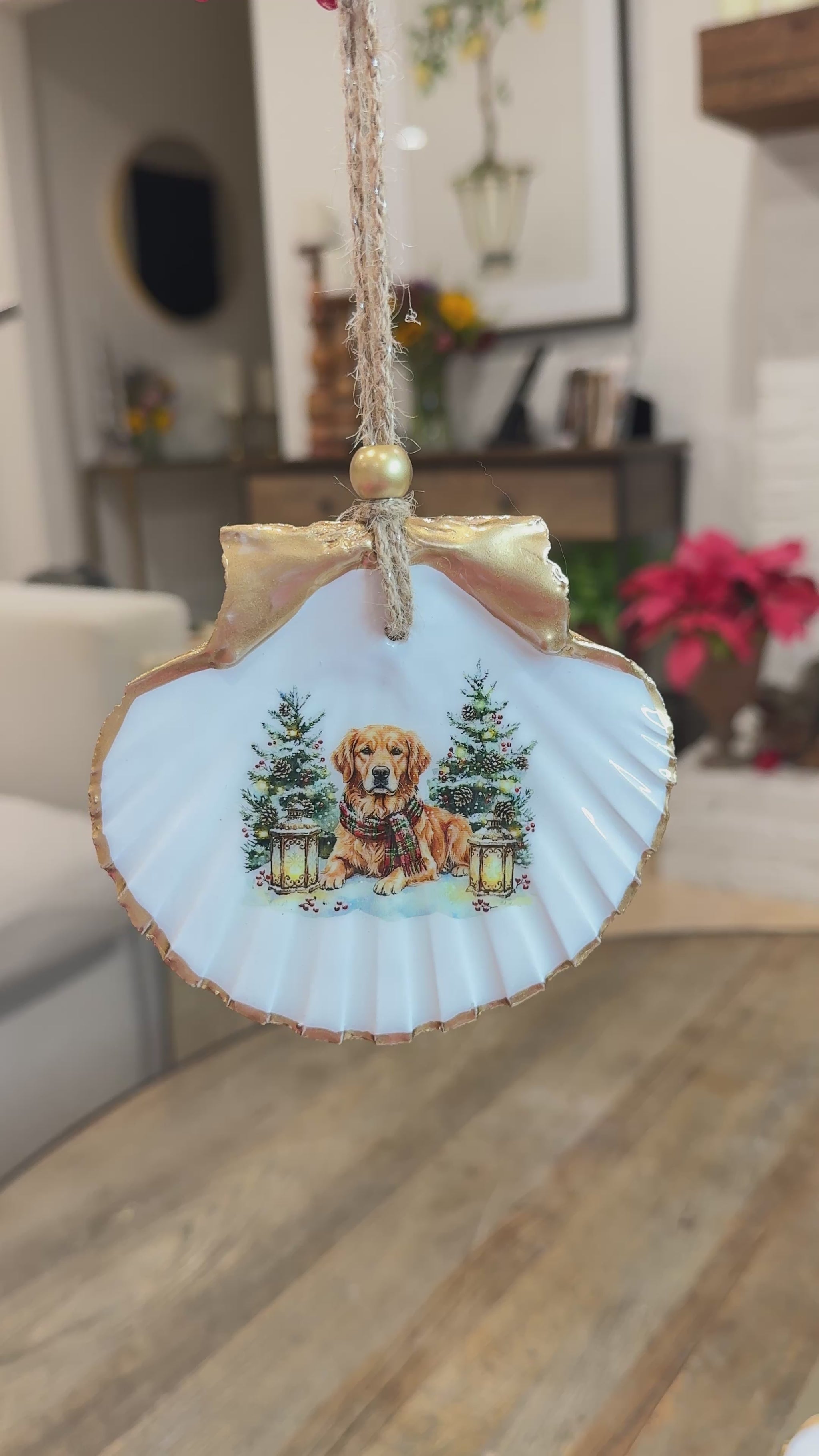 A lovely keepsake ornament with a Christmas Golden Retriever design. Hand decorated using a natural Irish Flat Scallop shel from the shores of the USA.