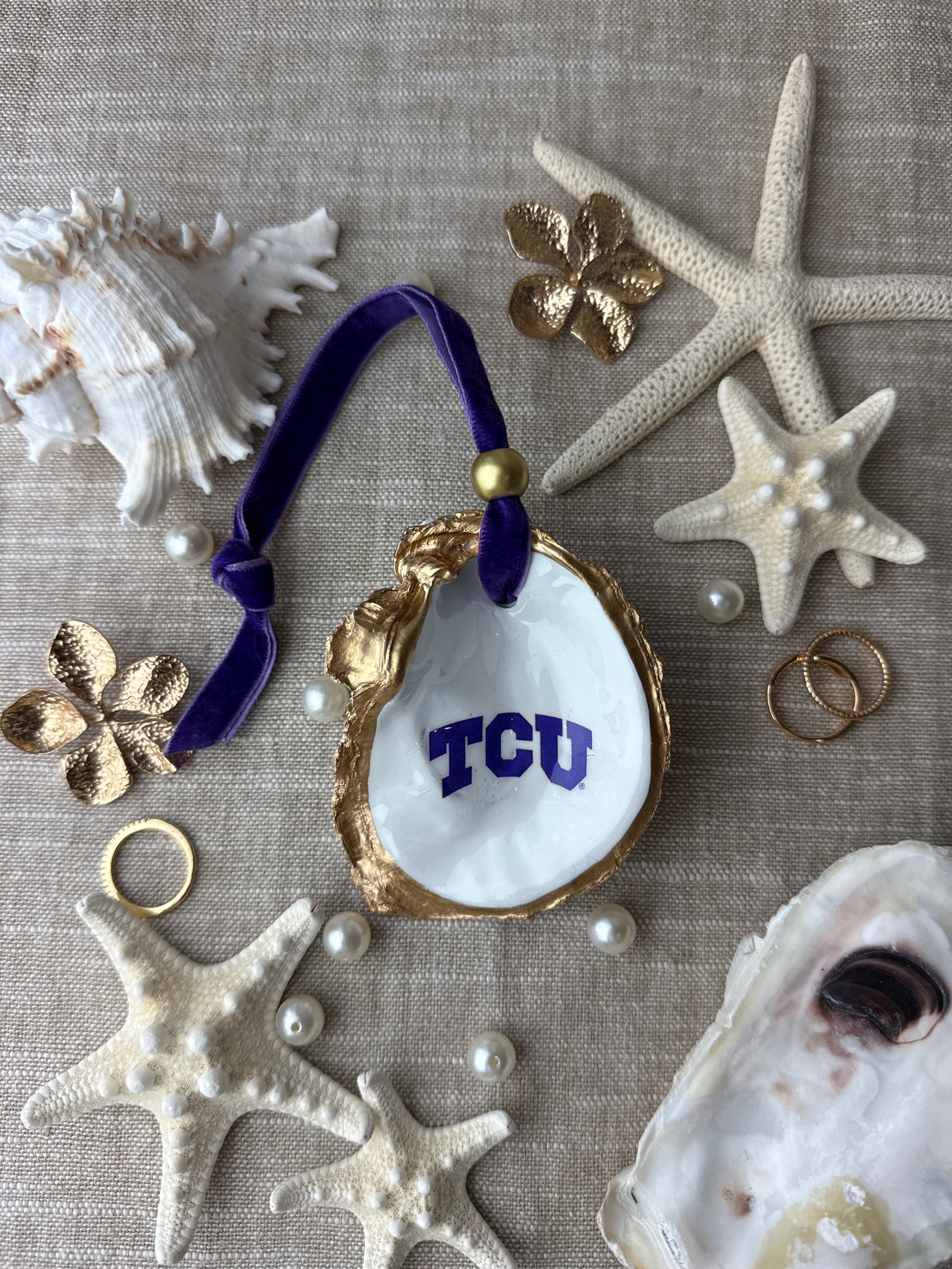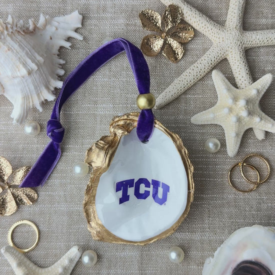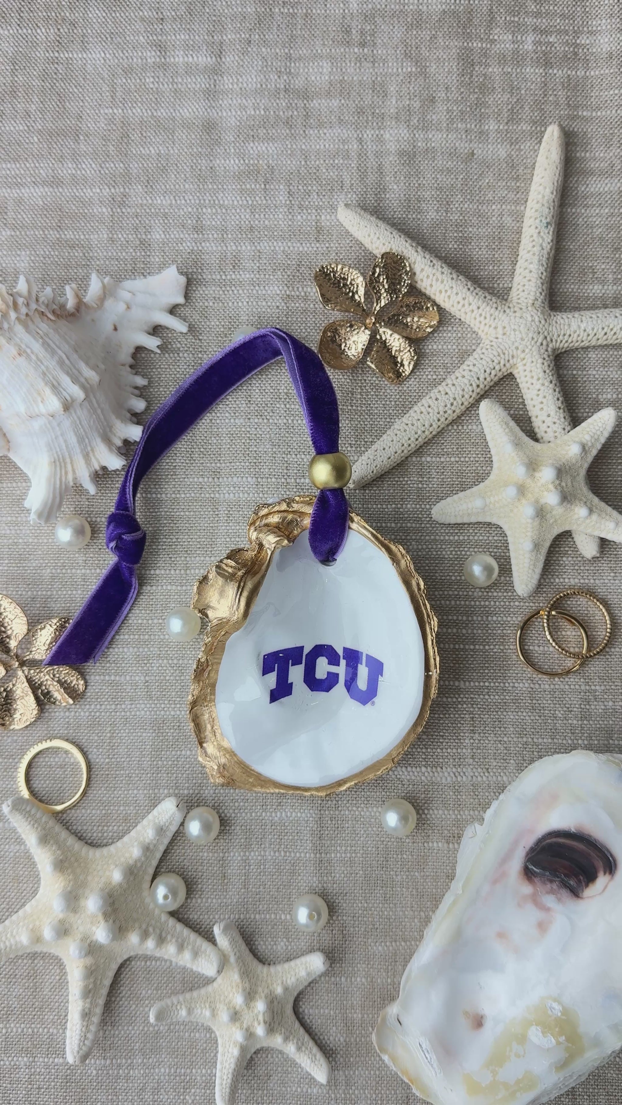 A lovely keepsake ornament with a purple TCU design. Hand decorated using a natural oyster from the shores of the USA.