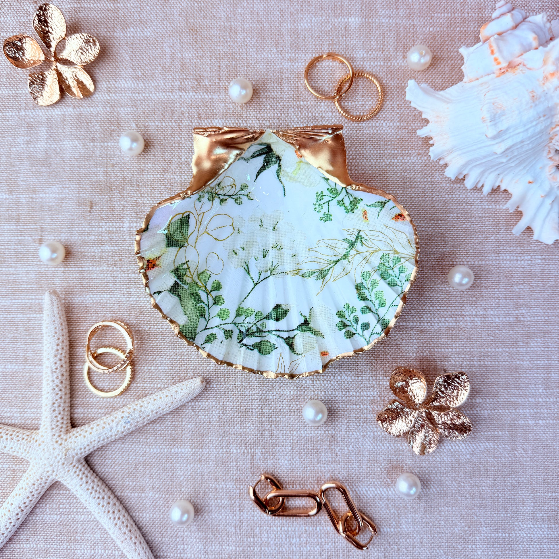 Medium fluted scallop shell ring dish with white and green floral design. Use this lovely keepsake as a trinket tray or ring dish to catch all your special little personal items, or simply display proudly in your home on a shelf or tabletop.